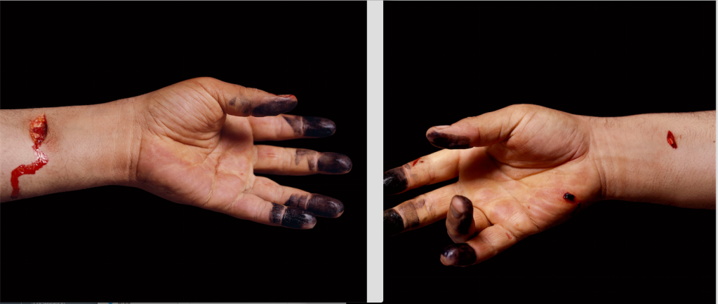 These two photographs, entitled The Morgue (Knifed to Death I and II) 1992, draw attention to an outstretched hand, perhaps an allusion to the fingers of God and Adam in Michelangelo’s famous fresco. Here, as in other works in the The Morgue series, the fragmented parts of the corpse, the limbs, the flesh, appear to be caught in motion, as if the gesture were suspended in time. The minute details, such as the ink on the fingertips, evoke a kind of presence, an imprint as a vital trace that endures even in death. The wounds on the arms refer to the crime announced in the title but also denote biblical symbolism.