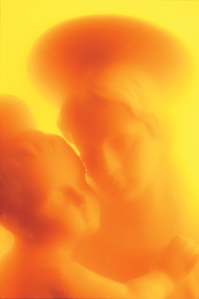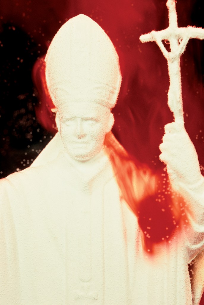 In this series, the artist immersed inexpensive religious figurines – a Madonna and Child, a white Pope, and a miniature crucifixion scene – in a yellowish-red fluid that he identified as a mixture of his own urine and blood. Illuminated by a warm light, the sacred figures are visually juxtaposed with the organic, abject quality of the liquid.