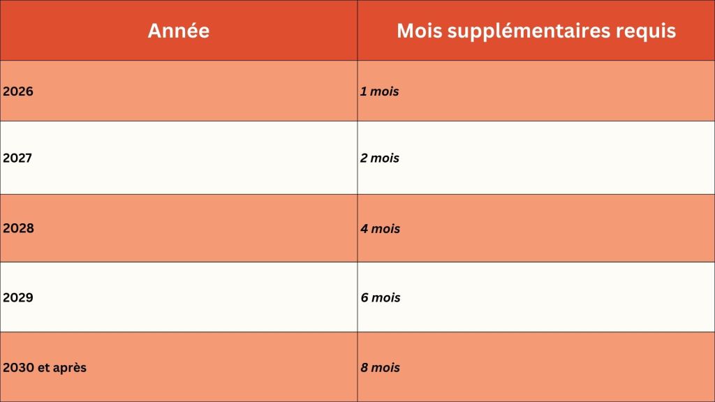 - Prolongation de la carrière professionnelle : À partir du 1er janvier 2026, la durée de 480 mois d’assurance obligatoire sera augmentée progressivement par des mois entiers de cotisations effectives allant jusqu’à huit mois, selon le calendrier suivant :